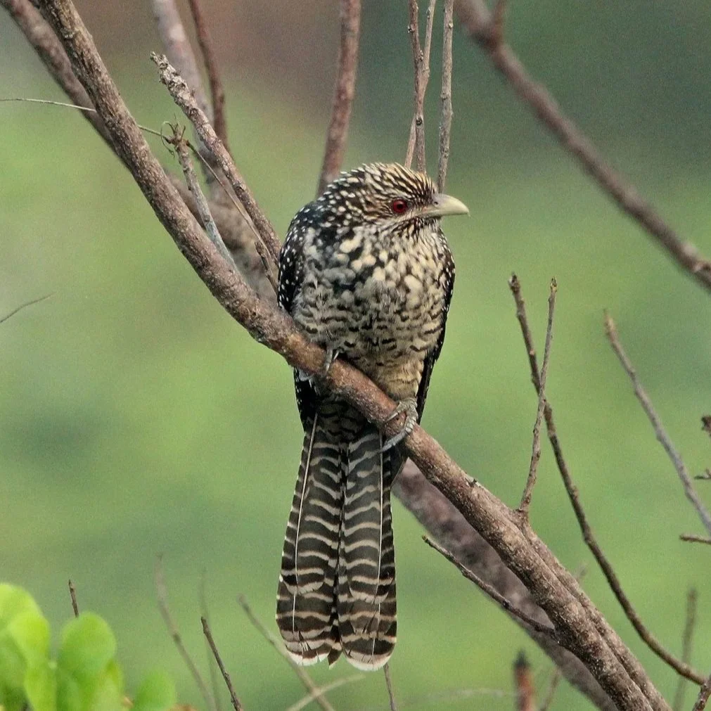 Description: large cuckoo species named after the male’s distinctive call, “ko-el”. The male and female look very different, the male being glossy black all over and the female speckled all over with dark brown upper parts, pale under parts and barred tail feathers. Both have distinctive red eyes, though this is usually more obvious on the male. Shy, therefore much more often heard than seen. Rarely comes to the ground, preferring to forage in trees.