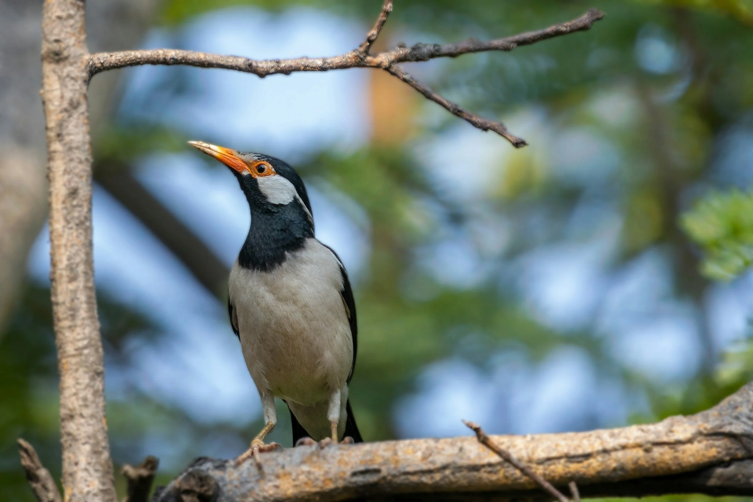 Description: the Myna’s glossy black head with its distinctive orange bare patch around the eye and orange beak stand out. The body is a rich brown, becoming paler towards the lower belly. Wings and tail are black when closed, however white patches on undertail and wings are visible in flight. Sexes alike. Often seen walking and hopping around on the ground where it forages. They roost communally (and very noisily) in large trees, often Banyans, and gather in huge numbers at dusk.