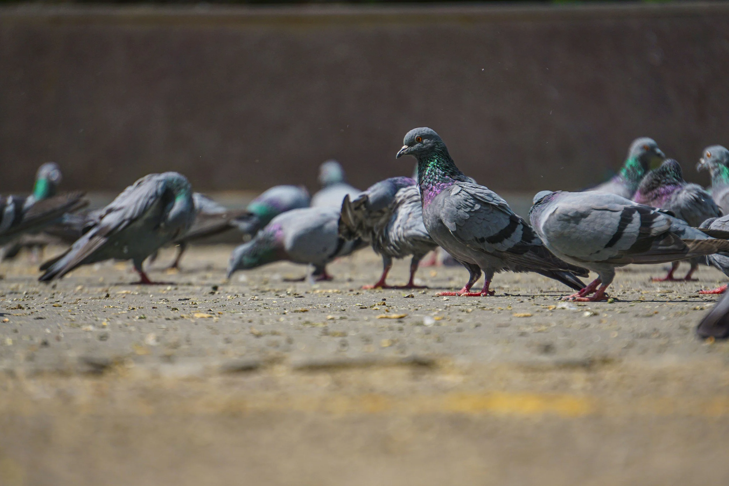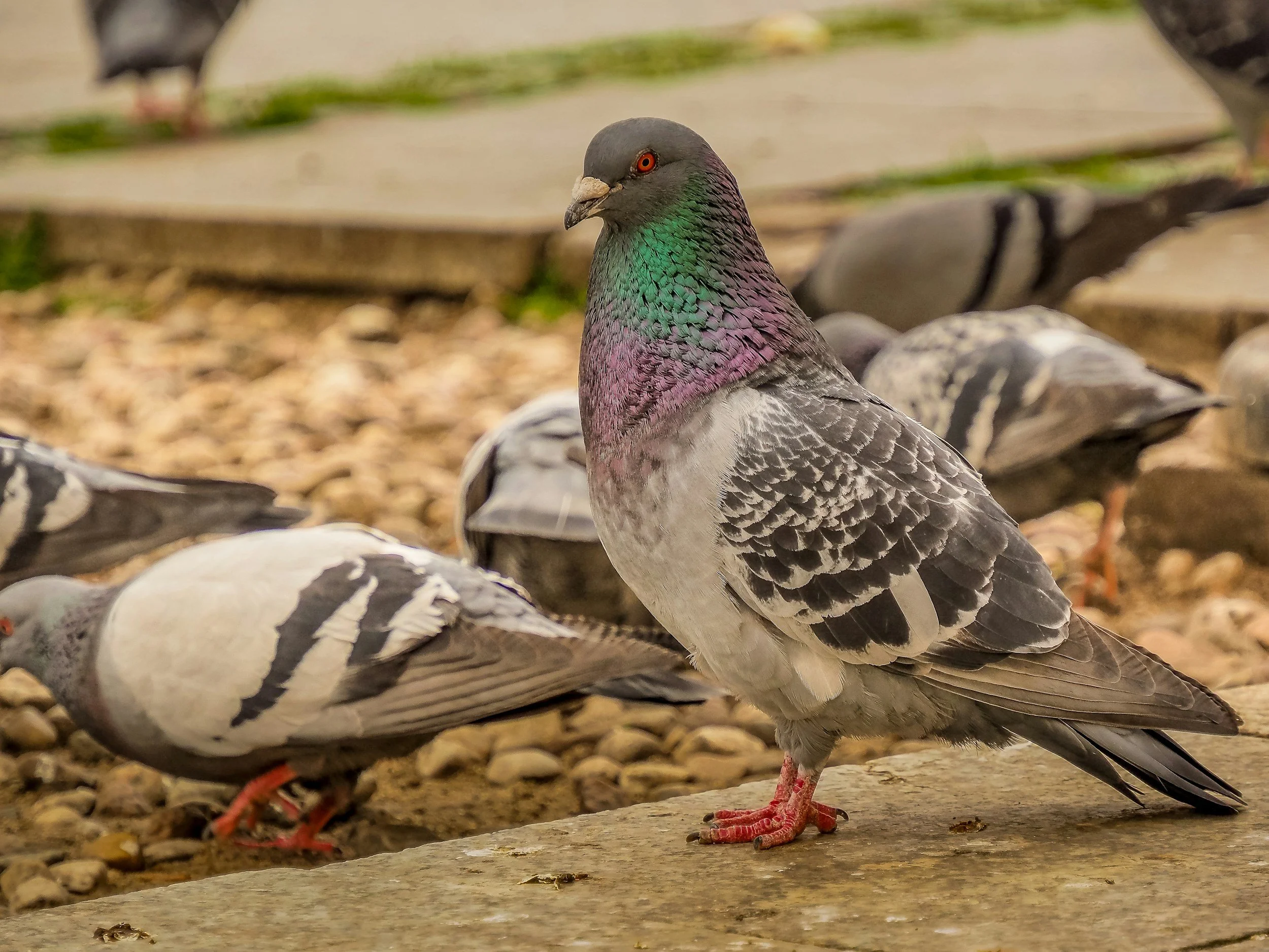 Description: body size and plumage colour vary wildly thanks to extensive breeding and release of domestic birds, but generally pale grey underparts with darker grey head and upper parts, often speckled on the wing. Throat often has iridescent green and purples.