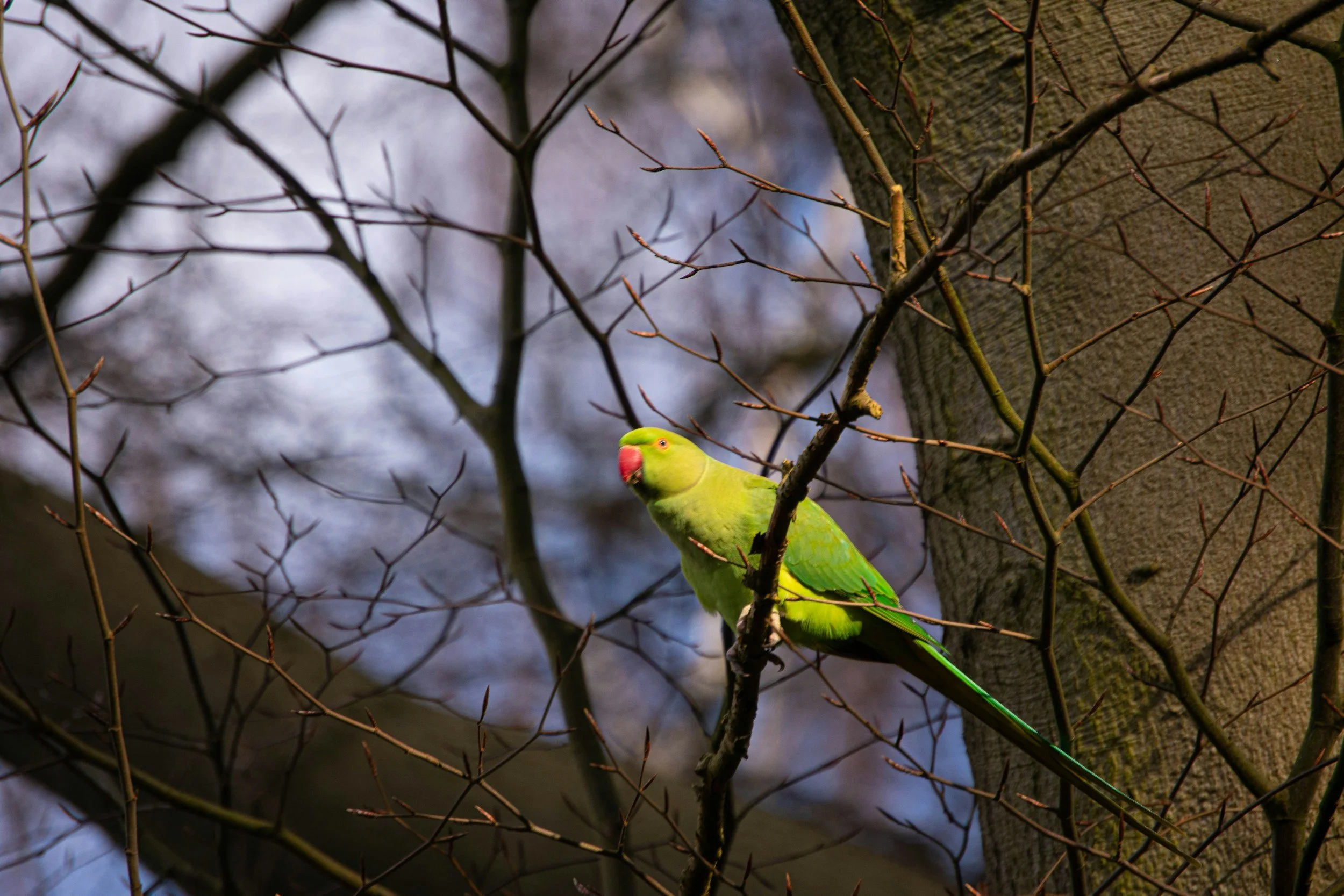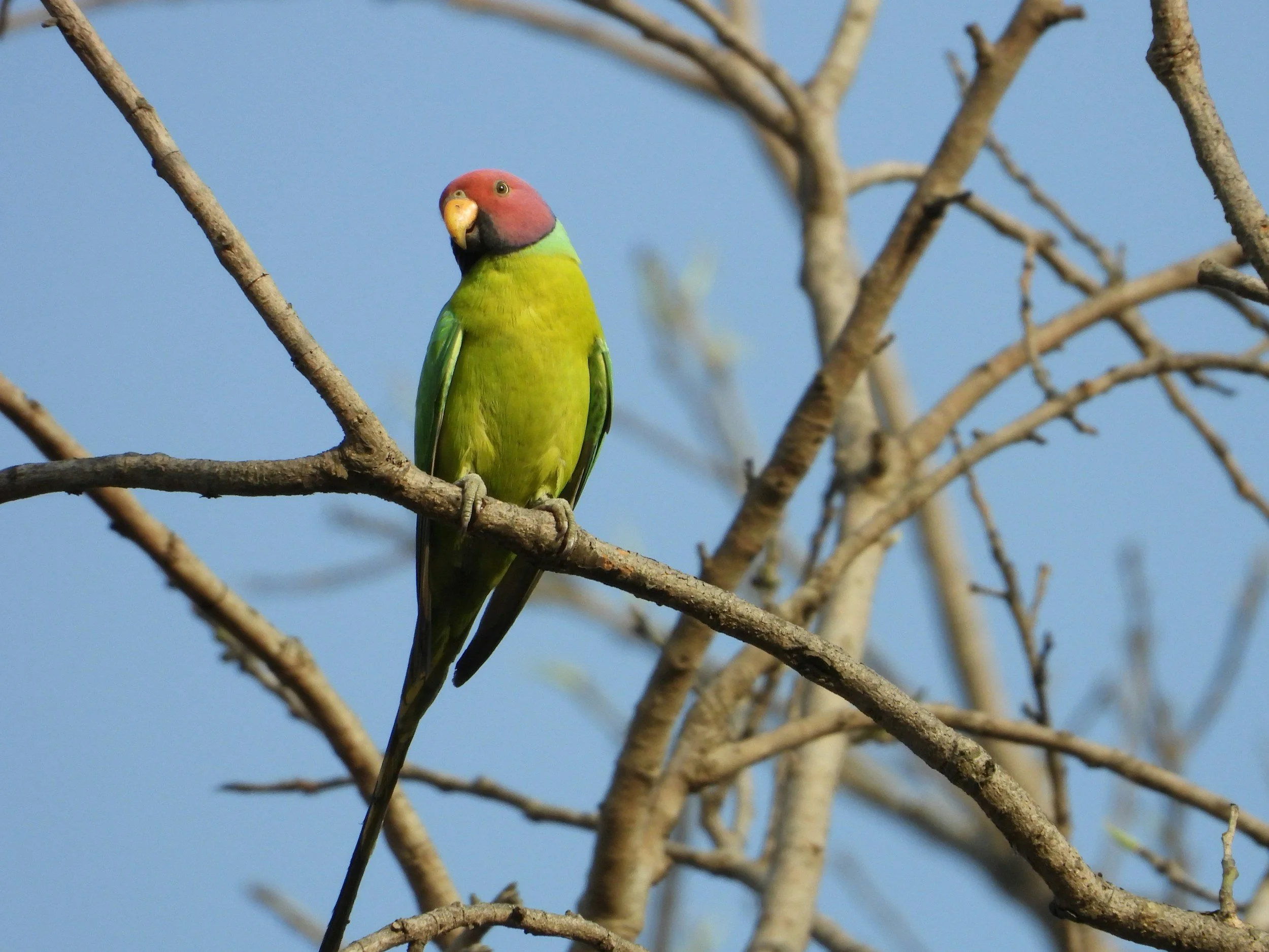 Male Rose-ringed Parakeet with the pink ring clearly visible.